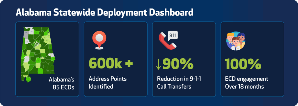 Client Overview Alabama has long been recognized as a pioneering state in 9-1-1 innovation — a legacy that began in Haleyville, Alabama, where the first-ever 9-1-1 call in the United States was placed on February 16, 1968. The Alabama 9-1-1 Board continues this legacy by overseeing emergency communications across the state, supporting 85 Emergency Communication Districts (ECDs) and more than 100 PSAPs across 67 counties. Alabama continues to lead the way with the Alabama Next Generation Emergency Network (ANGEN): a secure, IP-based network designed to support NG9-1-1 call delivery, location data exchange, and interoperability between Public Safety Answering Points (PSAPs). ANGEN enables faster, more accurate emergency response by routing calls based on precise geographic data rather than legacy systems tied to static boundaries. To function effectively, ANGEN relies on NG9-1-1 compliant GIS data, including standardized road centerlines, address points, and emergency service boundaries. These datasets ensure that emergency calls are routed to the correct PSAP based on the caller’s location, even in complex or rural environments. Without high-quality GIS data, the benefits of ANGEN’s advanced routing capabilities cannot be fully realized. Challenge In early 2020, the Alabama 9-1-1 Board embarked on one of the most ambitious public safety data initiatives in the country: preparing a statewide, NG9-1-1-compliant geospatial dataset to support the ANGEN network. This was no ordinary undertaking; it meant unifying GIS and PSAP leaders and elevating geospatial data across all 85 ECDs, each with its own level of GIS maturity, resources, and workflows. The Board recognized that solving these challenges would not only improve emergency response but also set a new standard for statewide collaboration and innovation. By partnering with DATAMARK Technologies, they positioned themselves as the driving force behind a transformative effort; one that required technical precision, strategic coordination, and a shared commitment to public safety excellence. The Plan To support Alabama’s bold vision for NG9-1-1 transformation, DATAMARK Technologies deployed a multi-phase strategy designed to match the scale and complexity of the statewide initiative. This wasn’t just about fixing data; it was about empowering 86 diverse ECDs to become active contributors to a unified, future-ready geospatial framework. Stakeholder Engagement & Training Recognizing the importance of local expertise, DATAMARK Technologies conducted regional training sessions and workflow management courses to build capacity across the state. These efforts ensured that each ECD, regardless of GIS maturity, was equipped to contribute meaningfully to the project. GIS Data Cleanup Services and Address Comparison Evaluation (ACE) DATAMARK Technologies worked hand-in-hand with local teams to remediate and standardize address points, road centerlines, and jurisdictional boundaries. Technology Adoption Each ECD received DATAMARK Technologies VEP Editor Subscriptions and VEP Verify, enabling real-time field validation and seamless data updates. This democratized data stewardship, allowing local teams to maintain GIS in alignment with NG9-1-1 standards. Through VEP, the ECDs were able to run over 250 NG9-1-1 validations on an unlimited basis, ensuring the highest levels of GIS data accuracy and completeness. Statewide GIS Data Aggregation Using DATAMARK Technologies VEP Aggregator, each ECD submitted GIS data to the state for validation, resolving gaps and overlaps along jurisdictional boundaries and producing a seamless, unified statewide dataset. Ongoing Support & Innovation Through GIS managed services, and continuous innovation led by Alabama’s VEP users, the partnership has remained agile and responsive to Alabama’s evolving needs. Results: The Alabama 9-1-1 Board’s bold vision and relentless coordination across 86 ECDs yielded extraordinary results, setting a new benchmark for statewide NG9-1-1 readiness. 100% ECD Participation Achieved in Just 18 Months: Through strategic leadership and inclusive collaboration, every ECD in the state contributed to GIS data collection and maintenance. This unprecedented level of engagement reflects a shared commitment to public safety and technological advancement. 600,000+ Address Points Identified: The successful remediation and enhancement of Alabama’s geospatial data filled critical gaps in emergency response coverage, dramatically improving location accuracy and dispatch efficiency across the state. Statewide Geospatial Call Routing Implemented: In September 2023, Alabama launched statewide geospatial call routing for wireless calls, an achievement made possible by the unified dataset. This milestone positioned the state as a national leader in NG9-1-1 innovation. Efforts continue to prepare the GIS address point and road centerlines for geospatial call routing of wireline calls with planned deployment in 2026. 60% Reduction in 9-1-1 Call Transfers: By routing calls based on precise geospatial data, Alabama significantly reduced call transfers, accelerating response times and enhancing outcomes for those in need. A Model for Sustained Innovation: The partnership between the Alabama 9-1-1 Board and DATAMARK Technologies continues to flourish, with Alabama’s forward-thinking feedback driving key enhancements to the VEP platform. Together, they remain committed to redefining what’s possible in public safety GIS—setting a standard for collaboration, adaptability, and continuous improvement. For more information on Alabama’s partnership with DATAMARK Technologies, check out our interview with Leah Missildine, director of the Alabama 9-1-1 Board here: https://youtu.be/uQzduLi4WkM In their own words: An interview with Leah Missildine, Executive Director of the AL 9-1-1 Board